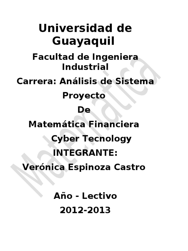Facultad de Ingeniera Industrial Carrera: Anlisis de Sistema Proyecto De Matemtica Financiera Cyber Tecnology INTEGRANTE: Vernica Espinoza Castro Ao - Lectivo 2012-2013