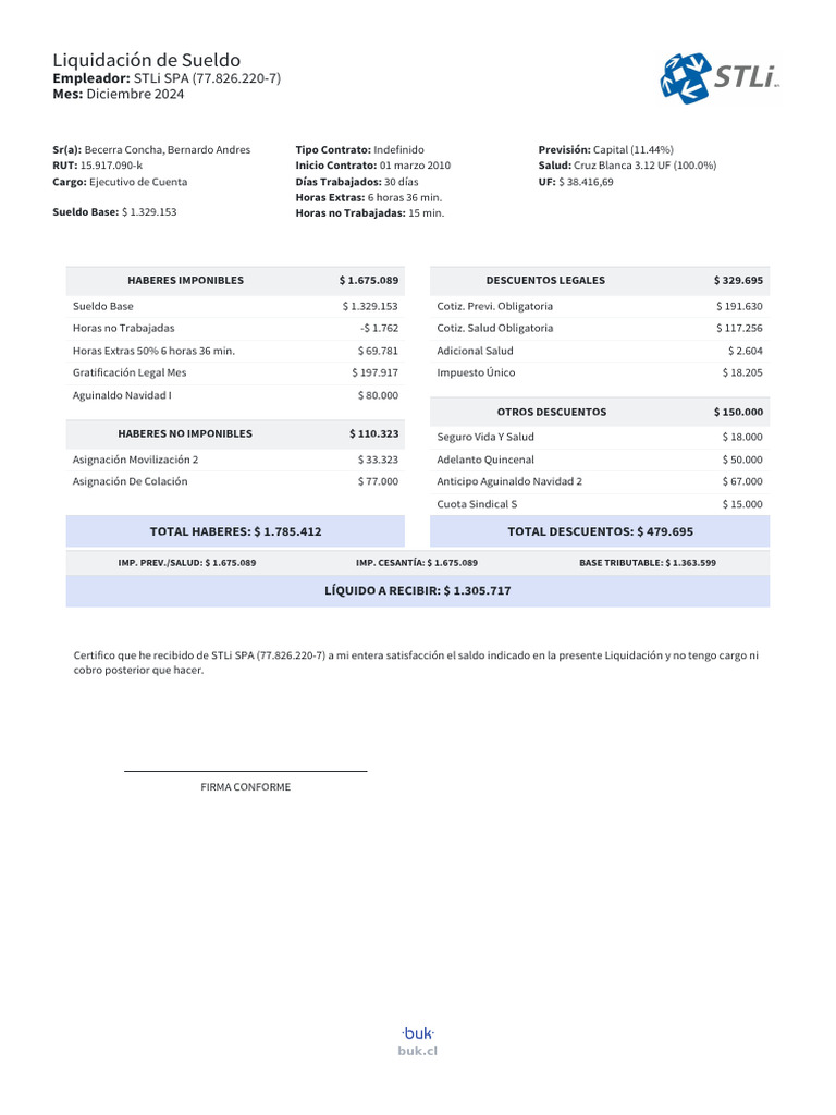 Certifico que he recibido de STLi SPA (77.826.220-7) a mi entera satisfacción el saldo indicado en la presente Liquidación y no tengo cargo ni
