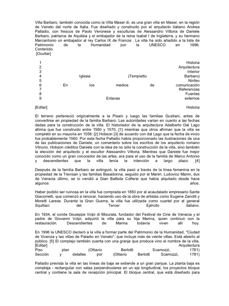 norte de Italia. Fue diseado y construido por el arquitecto italiano Andrea Palladio, con frescos de Paolo Veronese y esculturas de Alessandro Vittoria de Daniele Barbaro, patriarca de Aquileia y el embajador de la reina Isabel I de Inglaterra, y su hermano Marcantonio un embajador al rey Carlos IX de Francia . La villa ha sido aadido a la lista de Patrimonio de la Humanidad por la UNESCO en 1996. Contenido [Ocultar] 1 2 3 4 5 6 7 8 9 [Editar] Historia Arquitectura Interior Barbaro) Ninfeo comunicacin Referencias Fuentes externos Historia