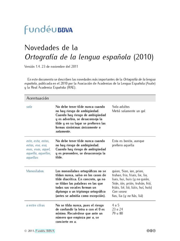 Versin 1.4. 23 de noviembre del 2011 En este documento se describen las novedades ms importantes de la Ortografa de la lengua espaola, publicada en el 2010 por la Asociacin de Academias de la Lengua Espaola (Asale) y la Real Academia Espaola (RAE).