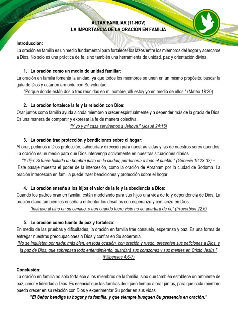 paz, amor y fidelidad a Dios. Es esencial que las familias dediquen tiempo a orar juntas, para que cada miembro