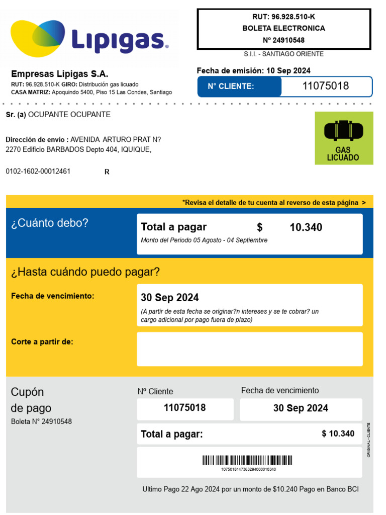 Ultimo Pago 22 Ago 2024 por un monto de $10.240 Pago en Banco BCI