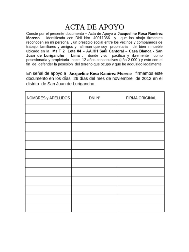 Conste por el presente documento – Acta de Apoyo a Jacqueline Rosa Ramírez