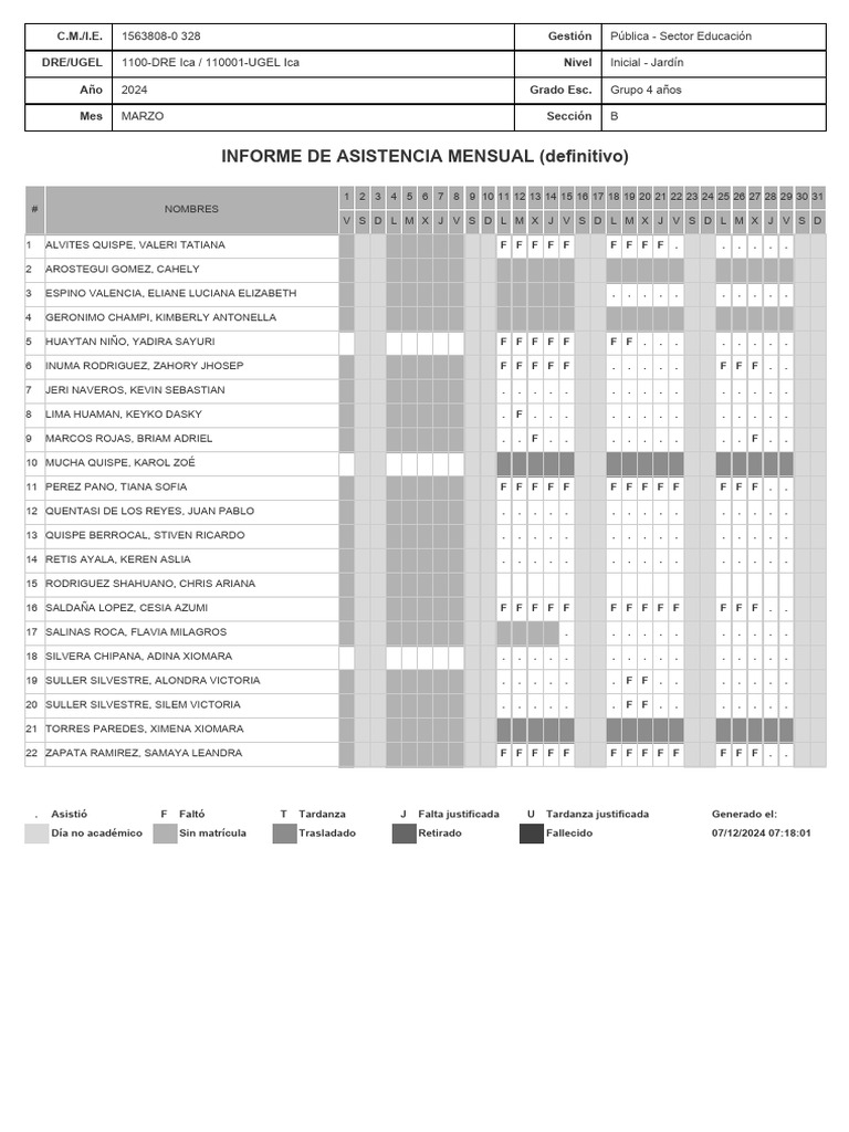 . Asistió F Faltó T Tardanza J Falta justificada U Tardanza justificada Generado el:
