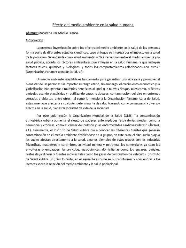 La presente investigación sobre los efectos del medio ambiente en la salud de las personas