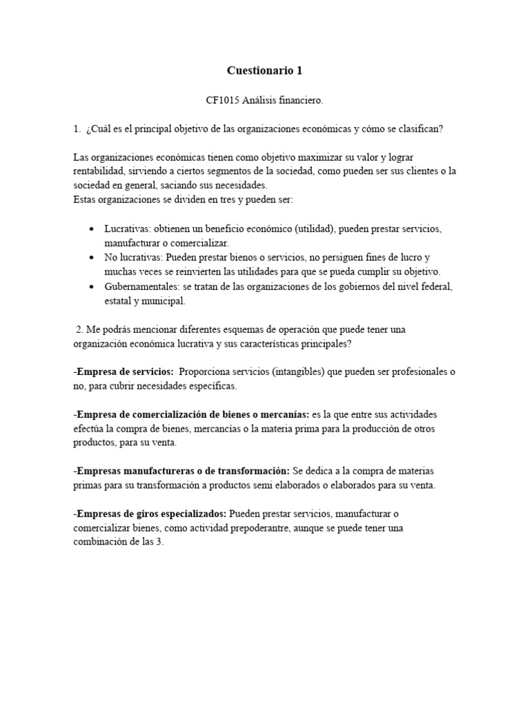 1. ¿Cuál es el principal objetivo de las organizaciones económicas y cómo se clasifican?