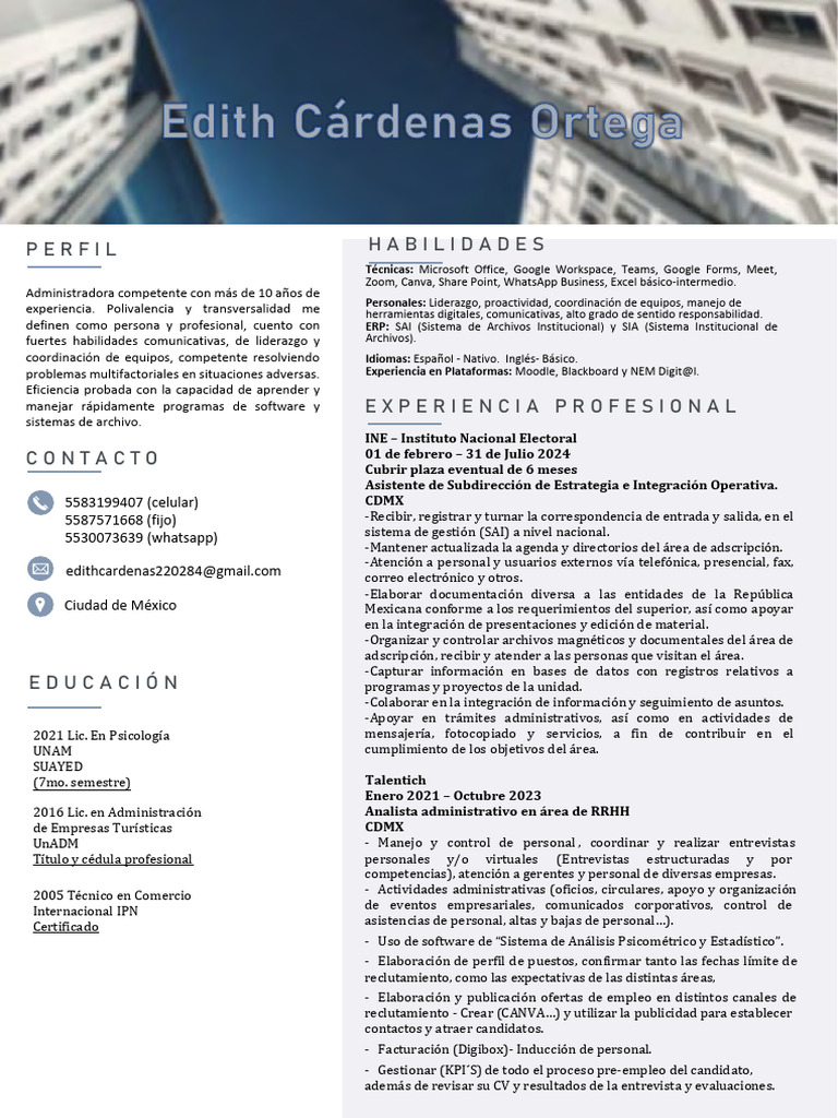 coordinación de equipos, competente resolviendo Idiomas: Español - Nativo. Inglés- Básico.