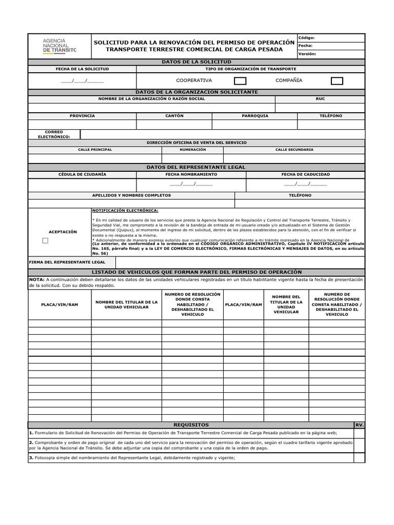 1. Formulario de Solicitud de Renovación del Permiso de Operación de Transporte Terrestre Comercial de Carga Pesada publicado en la página web;