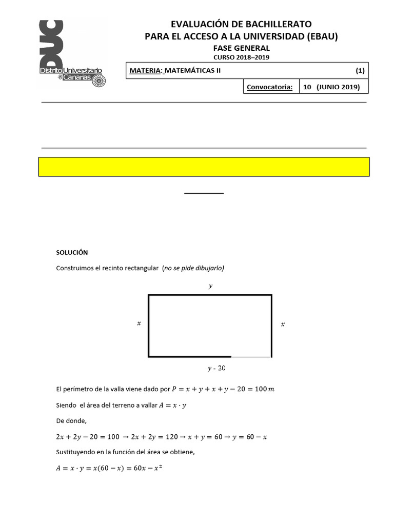 El perímetro de la valla viene dado por 𝑃 = 𝑥 + 𝑦 + 𝑥 + 𝑦 − 20 = 100 𝑚