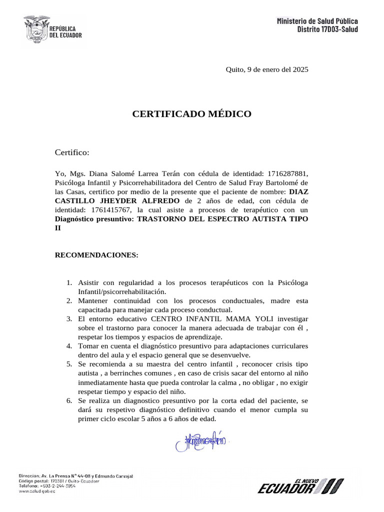 Diagnóstico presuntivo: TRASTORNO DEL ESPECTRO AUTISTA TIPO