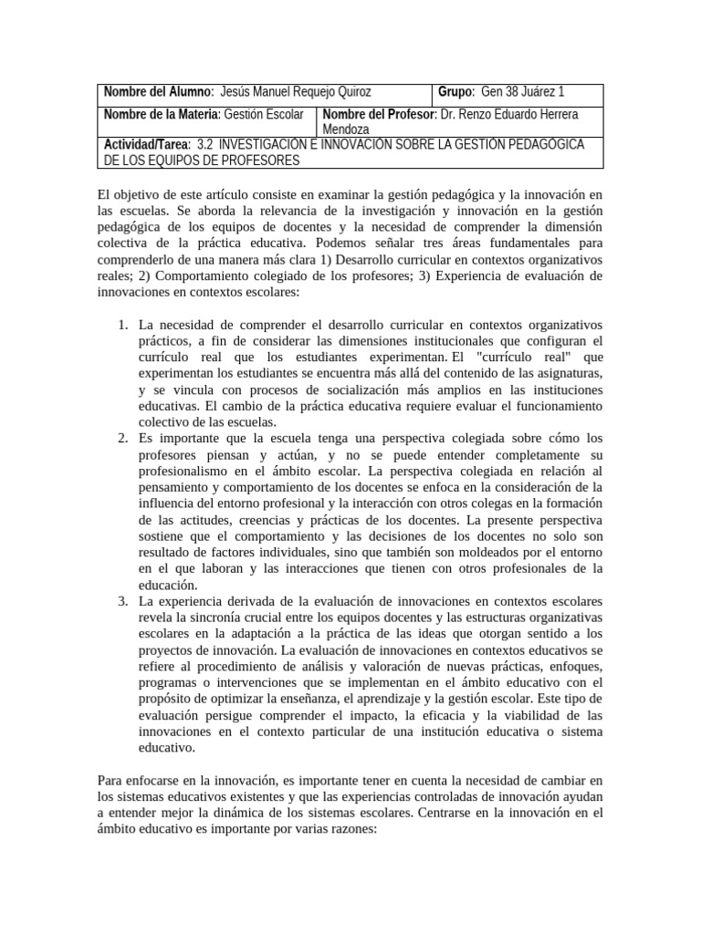 Actividad/Tarea: 3.2 INVESTIGACIÓN E INNOVACIÓN SOBRE LA GESTIÓN PEDAGÓGICA