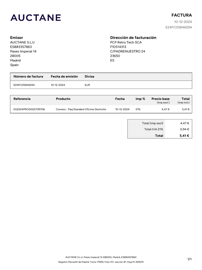 ES2024PRO0002709706 Correos - Paq Standard Oficina-Domicilio 10-12-2024 21% 4,47 € 5,41 €