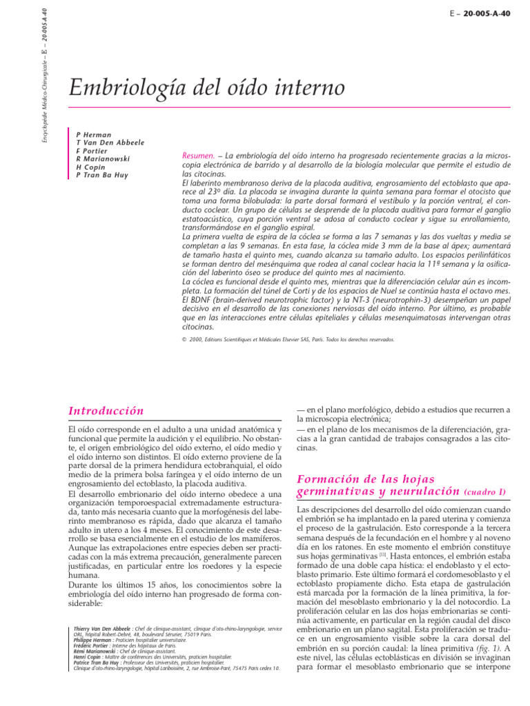 Cualquier referencia a este artículo debe incluir la mención del artículo original: Herman P, Van Den Abbeele T, Portier F, Marianowski R, Copin H et Tran Ba Huy, P. Embryologie de l’oreille interne.