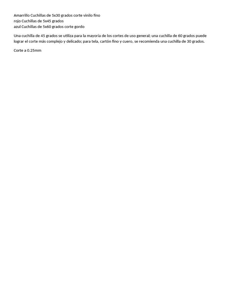 lograr el corte más complejo y delicado; para tela, cartón fino y cuero, se recomienda una cuchilla de 30 grados.