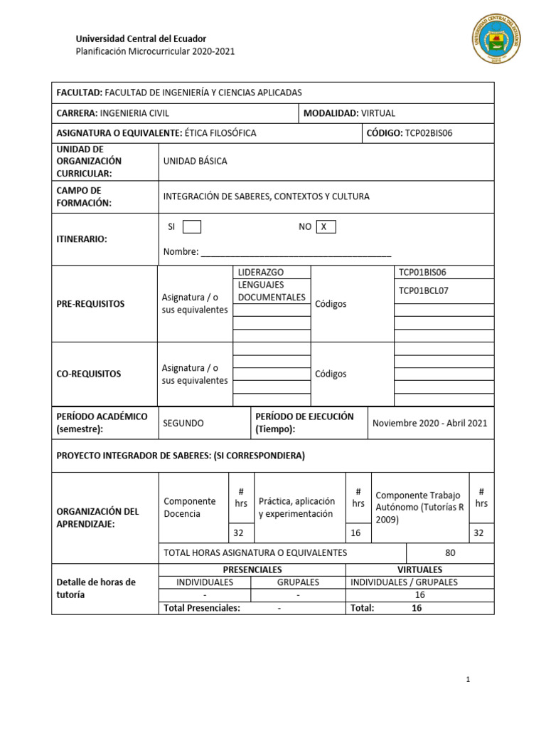 ASIGNATURA O EQUIVALENTE: ÉTICA FILOSÓFICA CÓDIGO: TCP02BIS06
