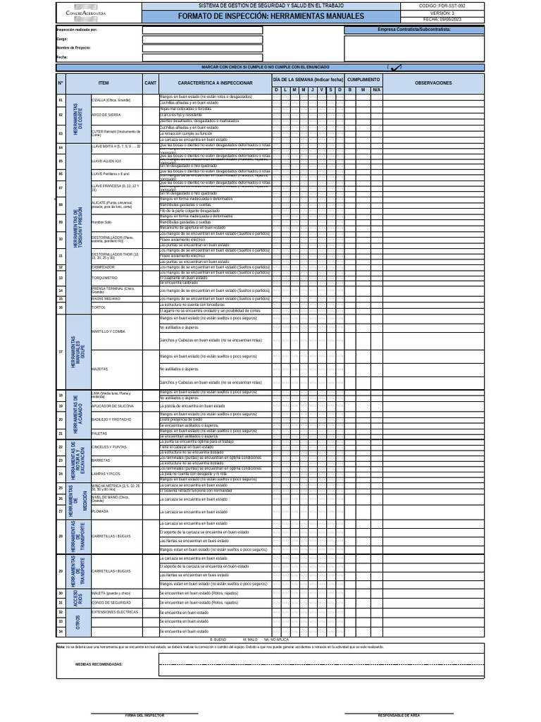 ITEM DESCRIPCION HERRAMIENTA A INSPECCIONAR SI NO N/A OBSERVACIONES