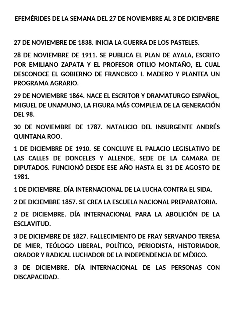 EFEMÉRIDES DE LA SEMANA DEL 27 DE NOVIEMBRE AL 3 DE DICIEMBRE
