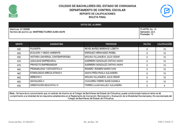 Nota.- Se hace de su conocimiento que, el carácter de Alumno en el Colegio de Bachilleres del Estado de Chihuahua, queda condicionado hasta en tanto se dé