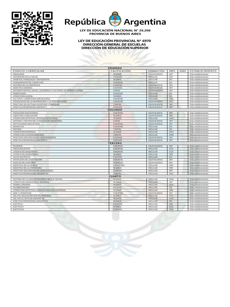 ESPACIO CURRICULAR CALIFICACIÓN CONDICIÓN MES AÑO ESTABLECIMIENTO