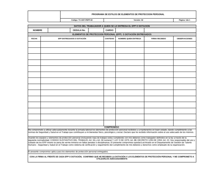 cuidado de los EPP mismo so pena de verme inmerso en faltas penales o disciplinarias. El presente compromiso quedará archivado en el Departamento de Gestión de Talento