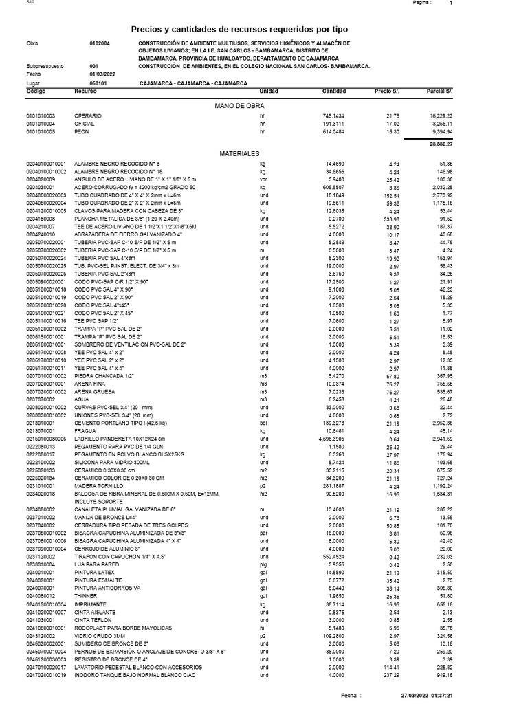 Subpresupuesto 001 CONSTRUCCIÒN DE AMBIENTES, EN EL COLEGIO NACIONAL SAN CARLOS- BAMBAMARCA.