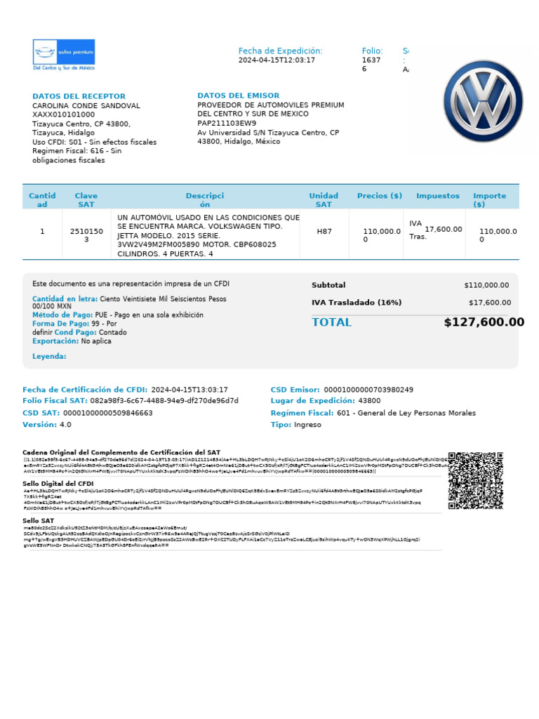 Fecha de Certificación de CFDI: 2024-04-15T13:03:17 CSD Emisor: 00001000000703980249