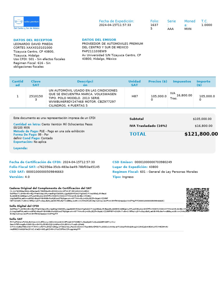 Folio Fiscal SAT: c762356e-35cb-483e-be49-78bf03a45145 Lugar de Expedición: 43800
