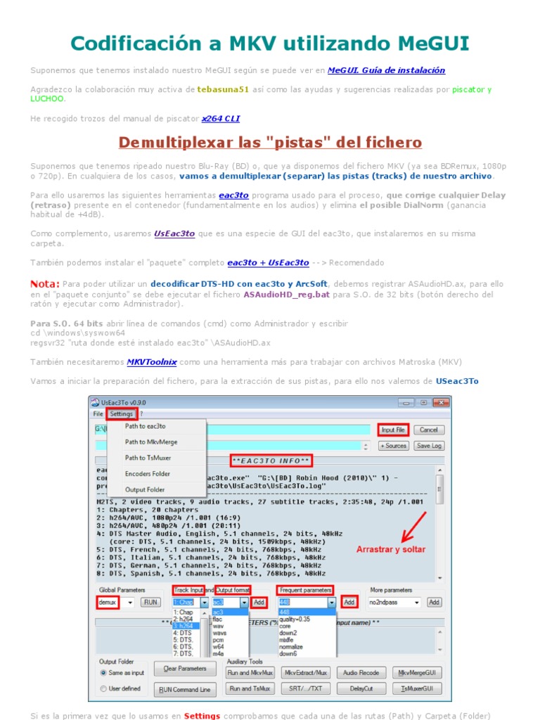Suponemos que tenemos ripeado nuestro Blu-Ray (BD) o, que ya disponemos del fic hero MKV (ya sea BDRemux, 1080p o 720p). En cualquiera de los casos, vamos a demultiplexar (separar) las pistas (tracks) de nuestro archivo. Para ello usaremos las siguientes herramientas eac3to programa usado para el proceso, que corrige cualquier Delay (retraso) presente en el c ontenedor (fundamentalmente en los audios) y elimina el posible DialNorm (gananc ia habitual de +4dB). Como complemento, usaremos UsEac3to que es una espec ie de GUI del eac3to, que instalaremos en su misma c arpeta. Tambin podemos instalar el "paquete" completo eac3to + UsEac3to - -> Rec omendado