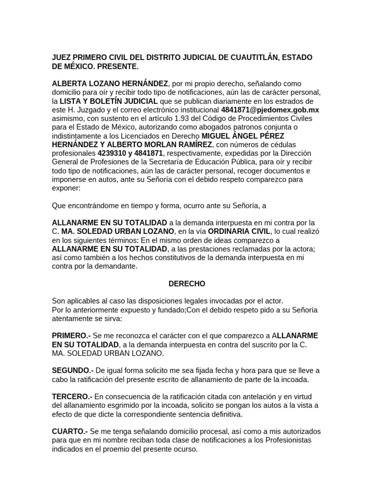 ALLANARME EN SU TOTALIDAD a la demanda interpuesta en mi contra por la