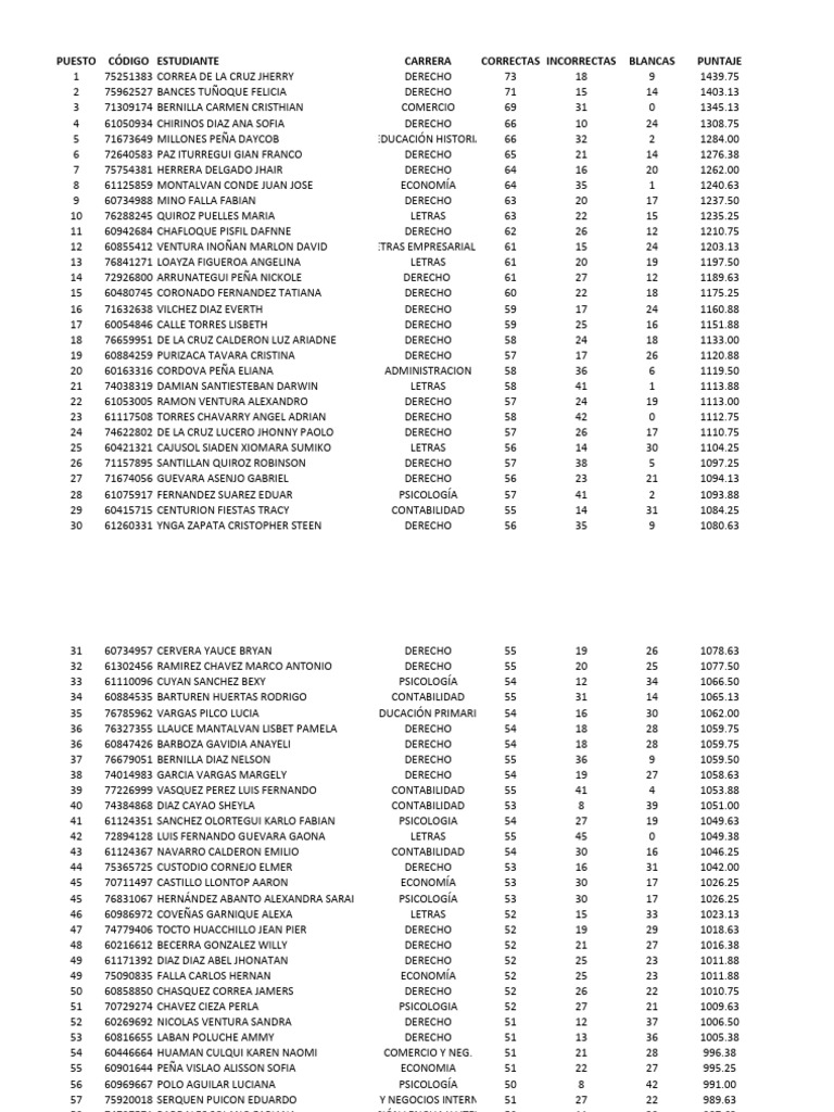 PUESTO CÓDIGO ESTUDIANTE CARRERA CORRECTAS INCORRECTAS BLANCAS PUNTAJE