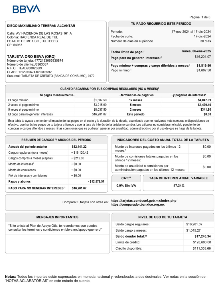 TARJETA ORO BBVA (ORO) Pago para no generar intereses:2 $16,201.07