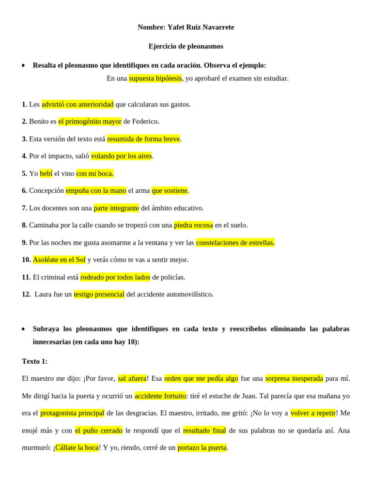 Subraya los pleonasmos que identifiques en cada texto y reescríbelos eliminando las palabras