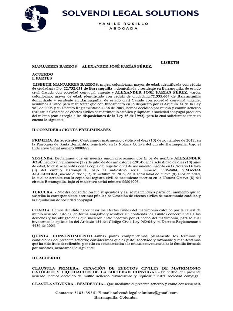 acuerdo, hemos decidido de mutuo acuerdo divorciarnos y liquidar nuestra sociedad conyugal.