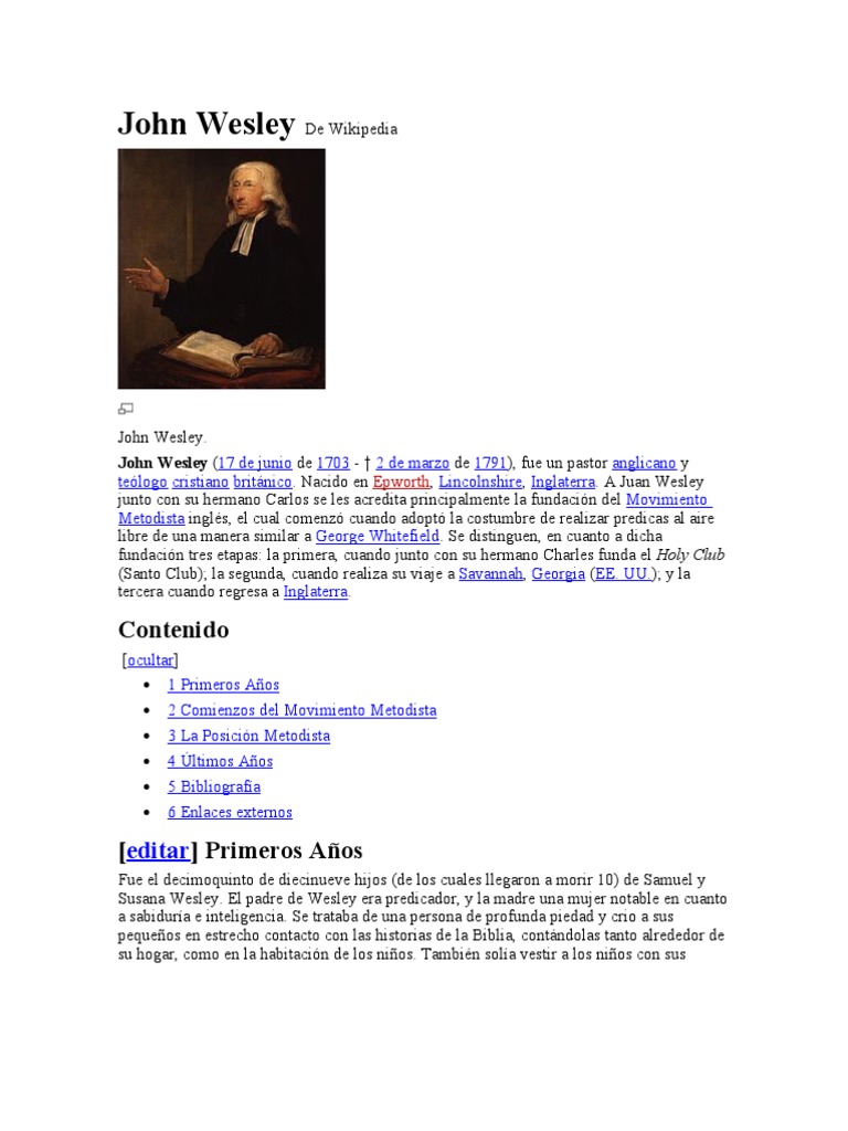 1 Primeros Aos 2 Comienzos del Movimiento Metodista 3 La Posicin Metodista 4 ltimos Aos 5 Bibliografa 6 Enlaces externos