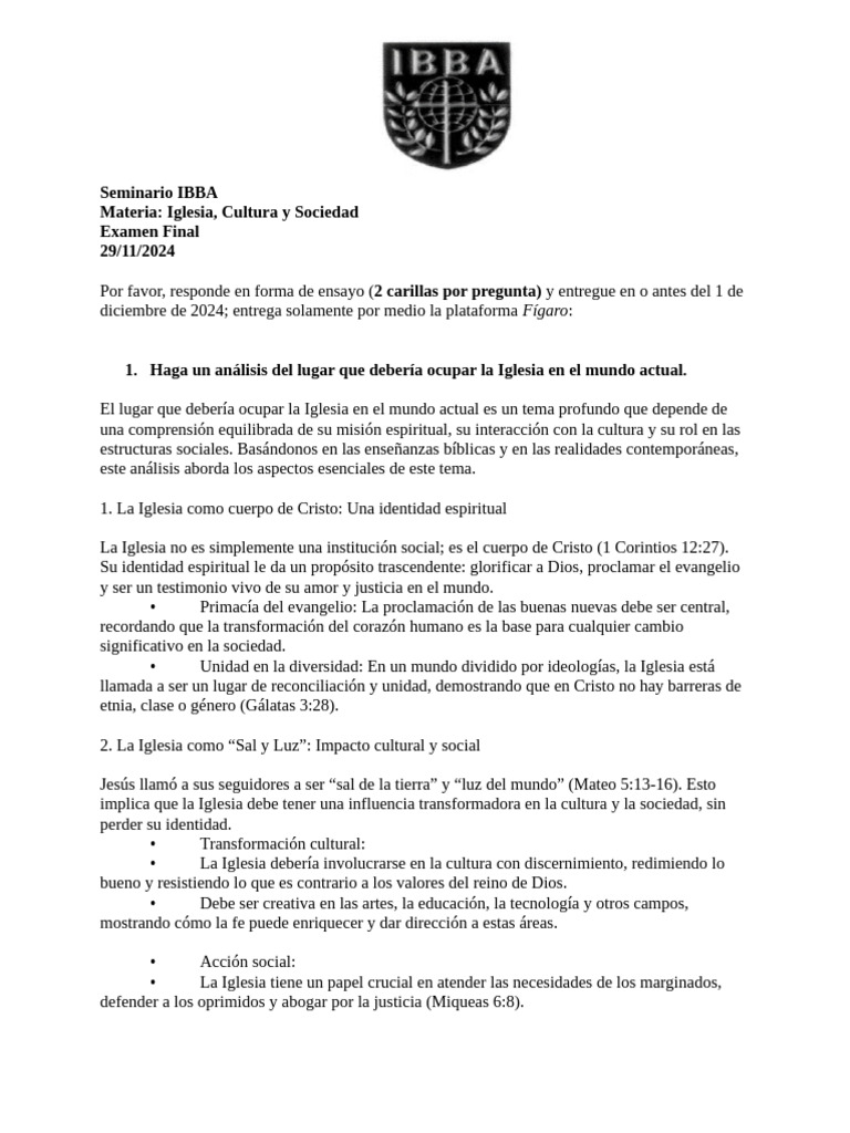 1. Haga un análisis del lugar que debería ocupar la Iglesia en el mundo actual.