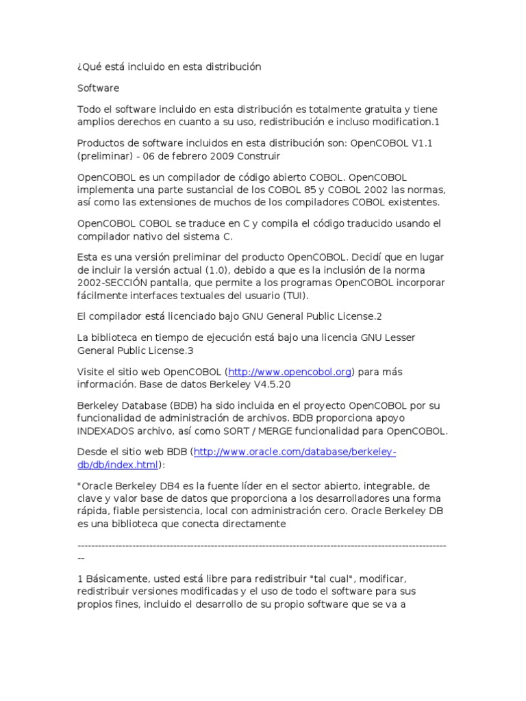 en cuanto a su uso, redistribucin e incluso modification.1 Productos de software incluidos en esta distribucin son: OpenCOBOL V1.1 (preliminar) - 06 de febrero 2009 Construir OpenCOBOL es un compilador de cdigo abierto COBOL. OpenCOBOL implementa una parte sustancial de los COBOL 85 y COBOL 2002 las normas, as como las extensiones de muchos de los compiladores COBOL existentes. OpenCOBOL COBOL se traduce en C y compila el cdigo traducido usando el compilador nativo del sistema C. Esta es una versin preliminar del producto OpenCOBOL. Decid que en lugar de incluir la versin actual (1.0), debido a que es la inclusin de la norma 2002-SECCIN pantalla, que permite a los programas OpenCOBOL incorporar fcilmente interfaces textuales del usuario (TUI). El compilador est licenciado bajo GNU General Public License.2 La biblioteca en tiempo de ejecucin est bajo una licencia GNU Lesser General Public License.3 Visite el sitio web OpenCOBOL (http://www.opencobol.org) para ms informacin. Base de datos Berkeley V4.5.20 Berkeley Database (BDB) ha sido incluida en el proyecto OpenCOBOL por su funcionalidad de administracin de archivos. BDB proporciona apoyo INDEXADOS archivo, as como SORT / MERGE funcionalidad para OpenCOBOL. Desde el sitio web BDB (http://www.oracle.com/database/berkeleydb/db/index.html): "Oracle Berkeley DB4 es la fuente lder en el sector abierto, integrable, de clave y valor base de datos que proporciona a los desarrolladores una forma rpida, fiable persistencia, local con administracin cero. Oracle Berkeley DB es una biblioteca que conecta directamente ------------------------------------------------------------------------------------------------------------1 Bsicamente, usted est libre para redistribuir "tal cual", modificar, redistribuir versiones modificadas y el uso de todo el software para sus propios fines, incluido el desarrollo de su propio software que se va a