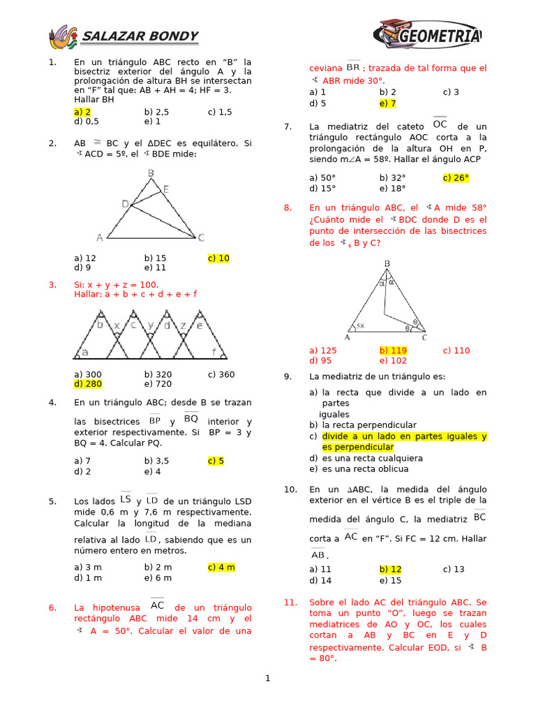 14. En un triángulo ABC se traza la bisectriz a) 2 b) 3 c) 1