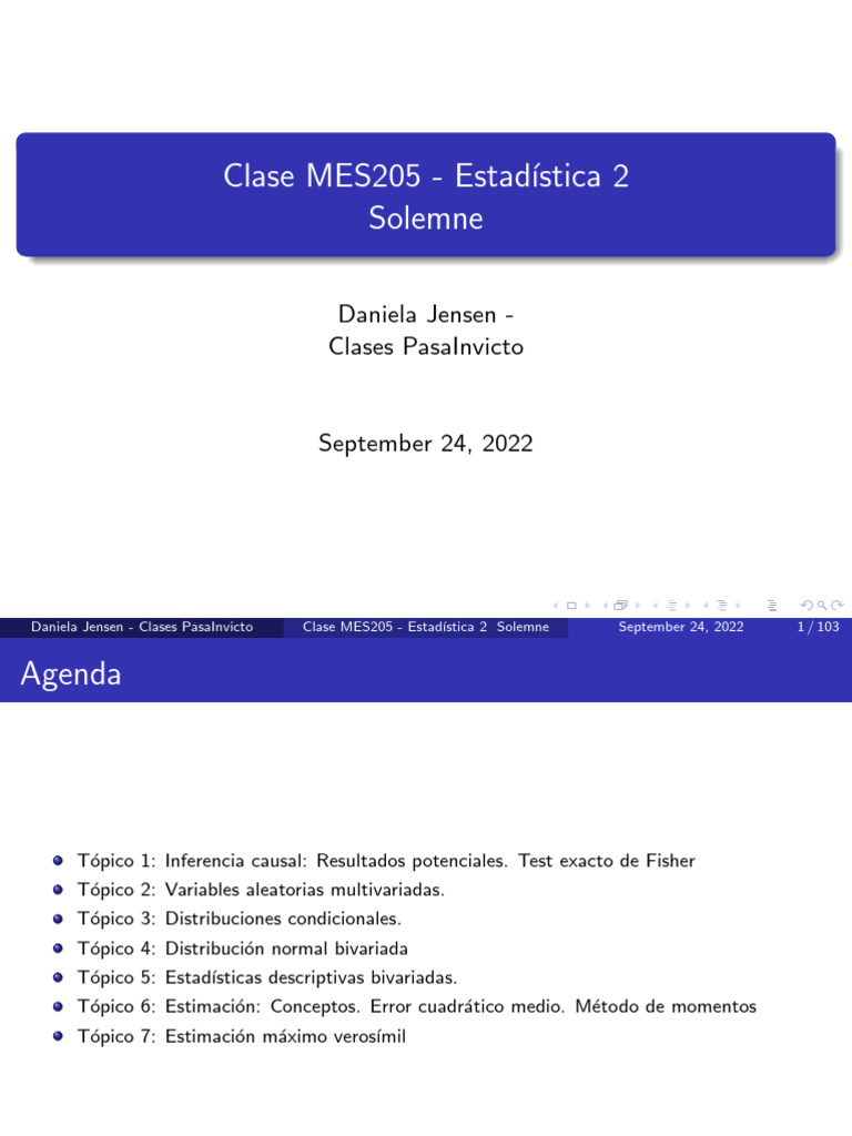 Daniela Jensen - Clases PasaInvicto Clase MES205 - Estadı́stica 2 Solemne September 24, 2022 4 / 103