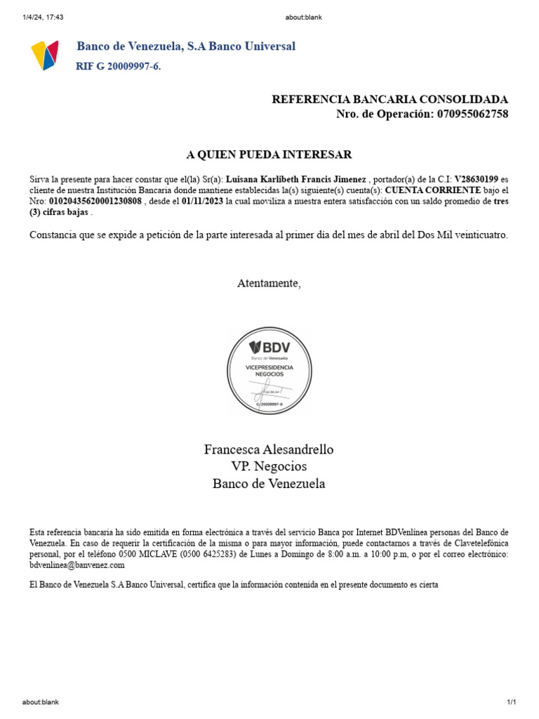 Esta referencia bancaria ha sido emitida en forma electrónica a través del servicio Banca por Internet BDVenlínea personas del Banco de