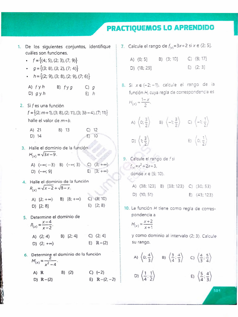 1. De los siguientes conjuntos, identifique 7. Calcule el rango de fix)- 3x+2 si x e (2; 5].