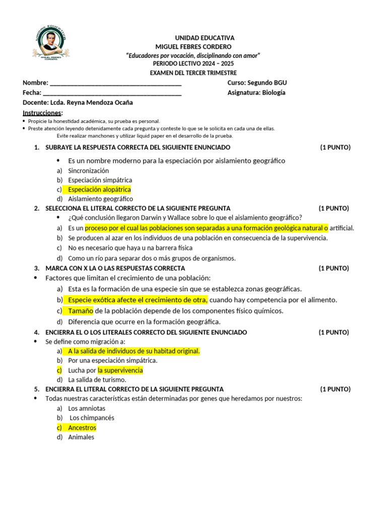 7. SUBRRAYE EL LITERAL CORRECTO DE LA SIGUIENTE PREGUNTA (1 PUNTO)