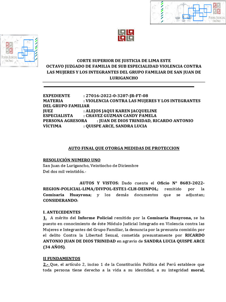 JUAN DE DIOS TRINIDAD; hacia la agraviada SANDRA LUCIA QUISPE
