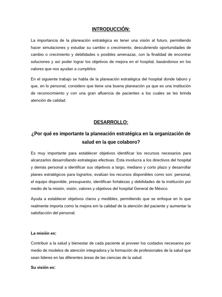 En el siguiente trabajo se habla de la planeación estratégica del hospital donde laboro y
