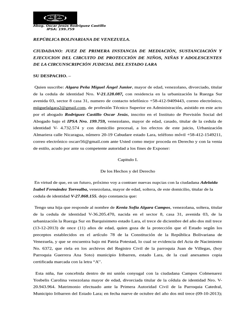 Quien suscribe: Algara Peña Miguel Ángel Junior, mayor de edad, venezolano, divorciado, titular