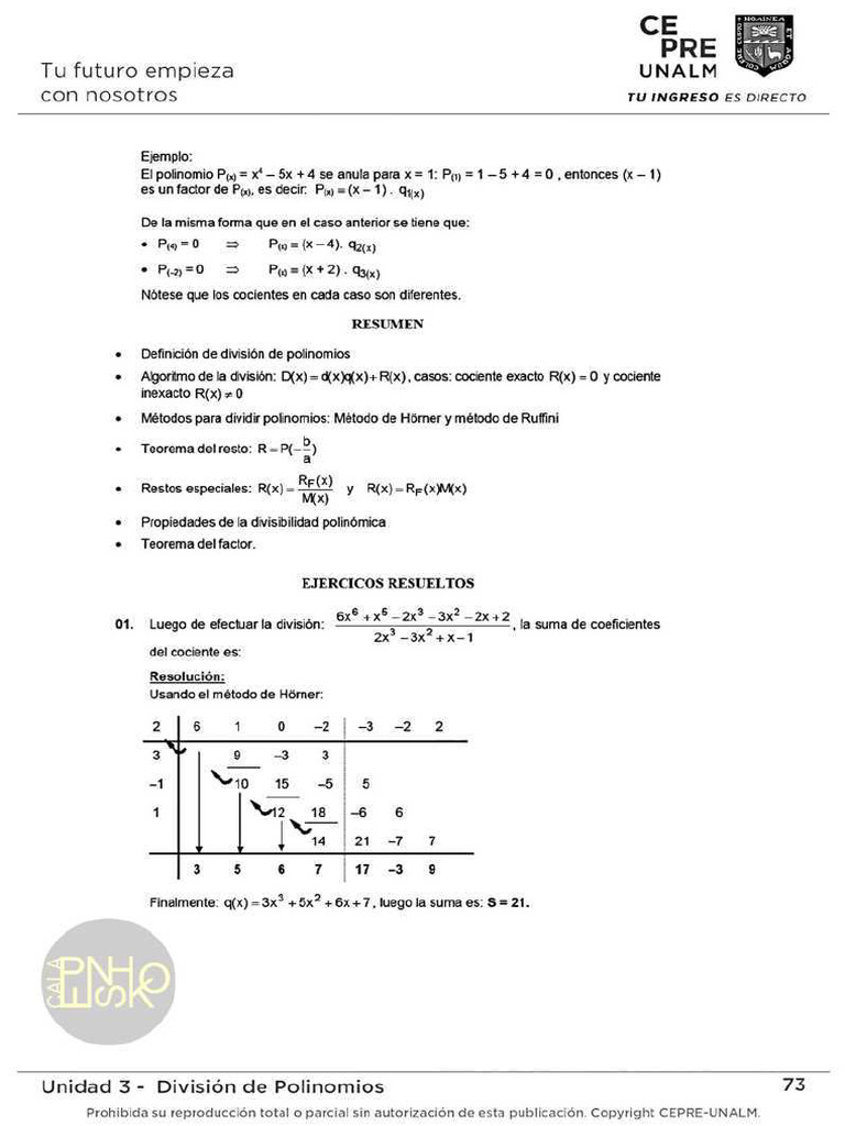 2% Reemplazando el valor de x=1 en el dividendo, se obtiene el resto: