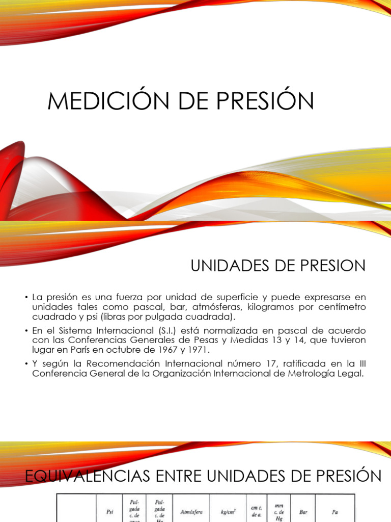 unidades tales como pascal, bar, atmósferas, kilogramos por centímetro