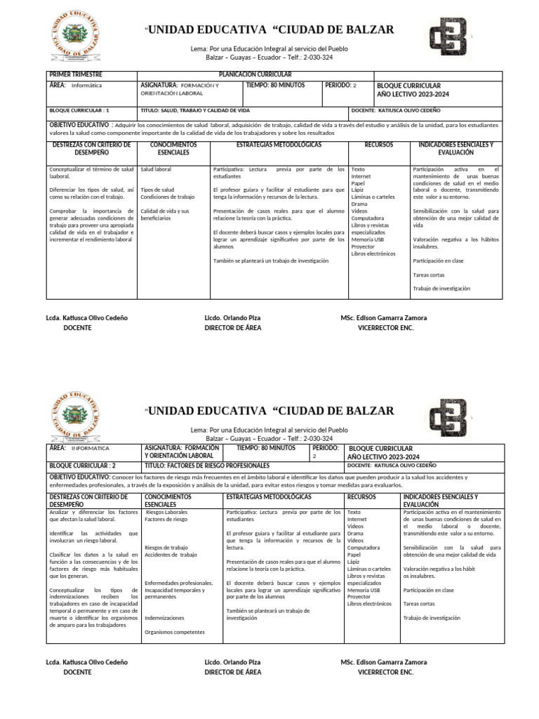 BLOQUE CURRICULAR : 1 TITULO: SALUD, TRABAJO Y CALIDAD DE VIDA DOCENTE: KATIUSCA OLIVO CEDEÑO