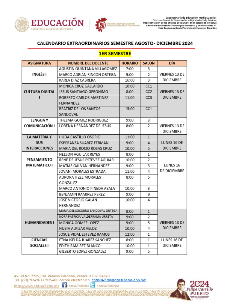 CALENDARIO EXTRAORDINARIOS SEMESTRE AGOSTO- DICIEMBRE 2024