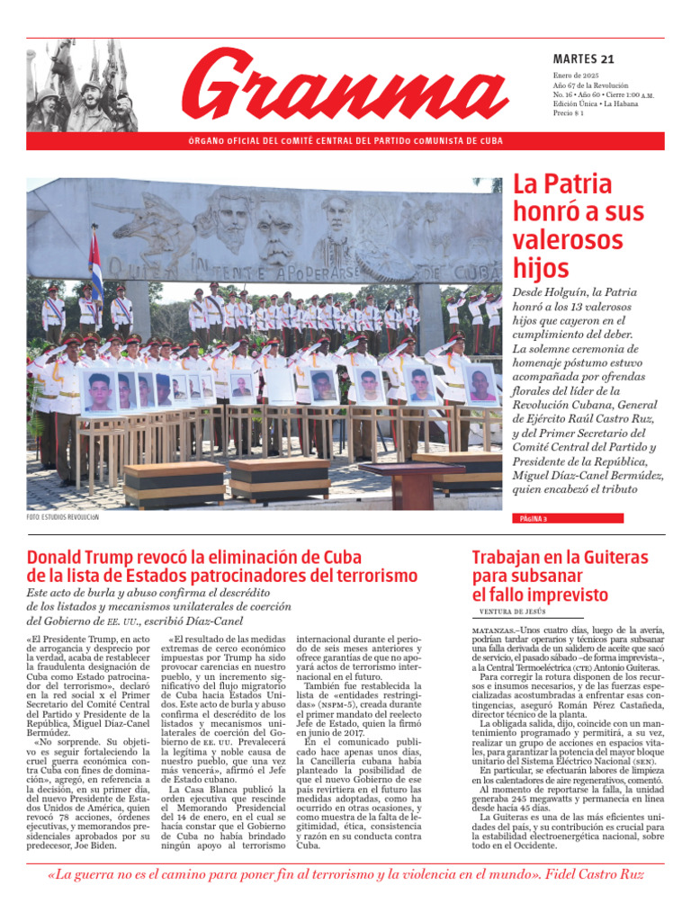 Subdirectores Oscar Sánchez Serra, Dilbert Reyes Territorial, Plaza de la Revolución, La Habana, Cuba. ISSN 0864-0424 / Impreso en UEB Gráfica de La Habana @Granma_Digital