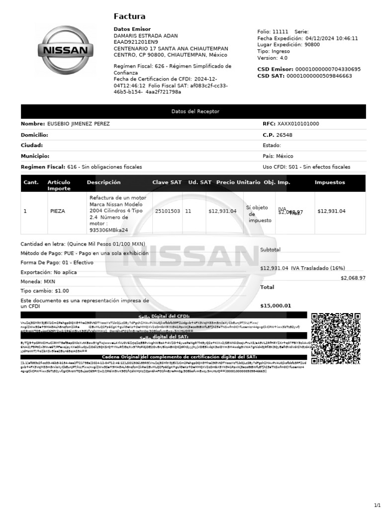 Nombre: EUSEBIO JIMENEZ PEREZ RFC: XAXX010101000